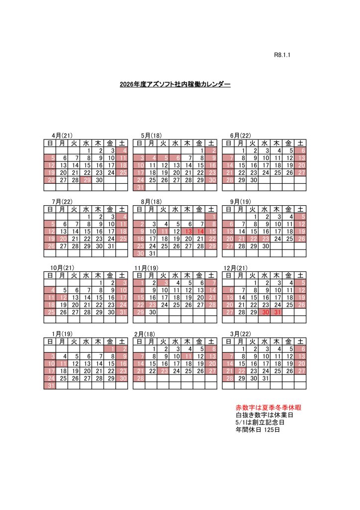 アズソフト株式会社の2026年度の稼働日をご案内いたします。